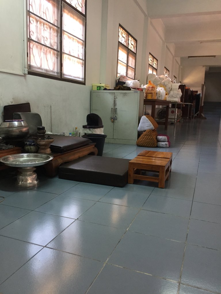 Compramos un pack de ofrendas por 75 baths: una caja de tabaco, velas, incienso y unas flores. Entramos en la sala en silencio y nos sentamos a esperar. Hay alrededor de treinta personas en la sala.